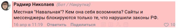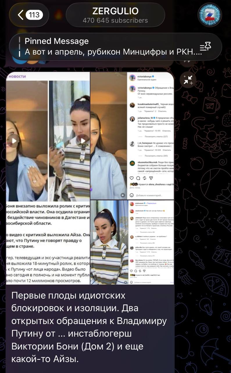 - ️В комментариях боты упоминают участие Бони в реалити-шоу «Дом-2», прошлые высказывания про облучение от вышек 5G, а также жизнь в Монако. Боню обвинили в употреблении «то ли кактусов, то ли грибов», а также «показушном патриотизме ради просмотров в интернете». «Местная „Навальная“? Кем она себя возомнила? Сайты и мессенджеры блокируются только те, что нарушили законы РФ», — написал один из ботов.