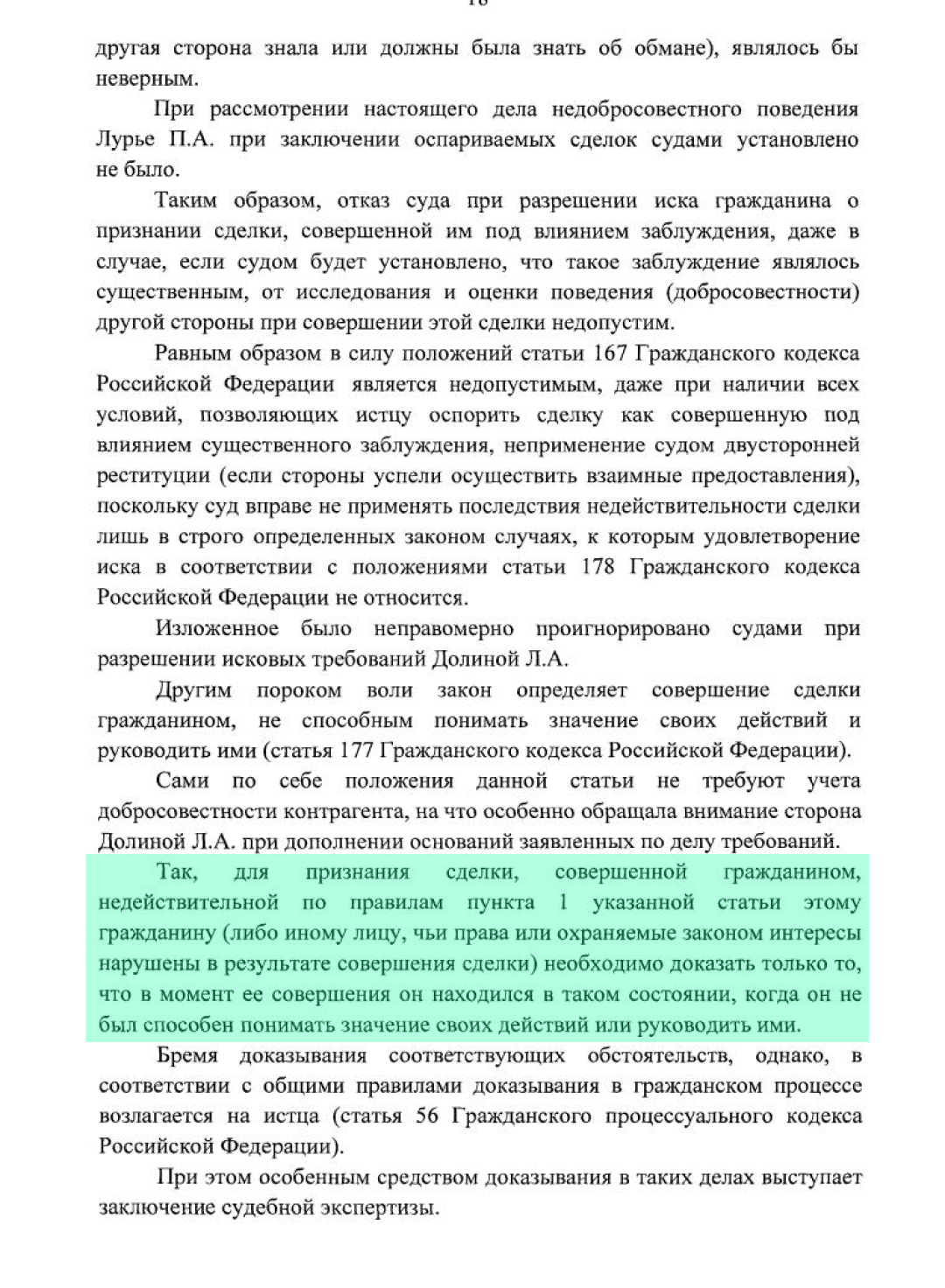 - ️При этом Верховный суд назвал ситуацию, при которой сделка может быть признана недействительной: «для признания сделки, совершенной гражданином, недействительной» «необходимо доказать только то, что в момент ее совершения он находился в таком состоянии, когда он не был способен понимать значение своих действий или руководить ими». Малютин считает, что такая формулировка является «тревожной» и «оставляет возможность оспаривать сделки через проведение судебной экспертизы». Однако юрист предлагает пока не «паниковать» и дождаться обзора судебной практики ВС РФ, в котором может появиться необходимое уточнение по этому пункту.