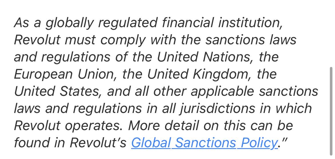 • В пресс-службе Revolut в ответ на просьбу «Агентства» прокомментировать ситуацию сообщили, что «обязаны соблюдать законы и нормативные акты о санкциях Организации Объединенных Наций, Европейского союза, Великобритании, США» и всех других юрисдикций, где работает компания. Согласно трактовке банка, шаги предприняты для обеспечения немедленного соблюдения нового пакета санкций ЕС, введенного 23 октября. Согласно ему, продолжение обслуживания россиян возможно лишь в том случае, если у них есть гражданство или непросроченный вид на жительства (временный или постоянный) в государствах-членах ЕС, Европейской экономической зоны или Швейцарии.