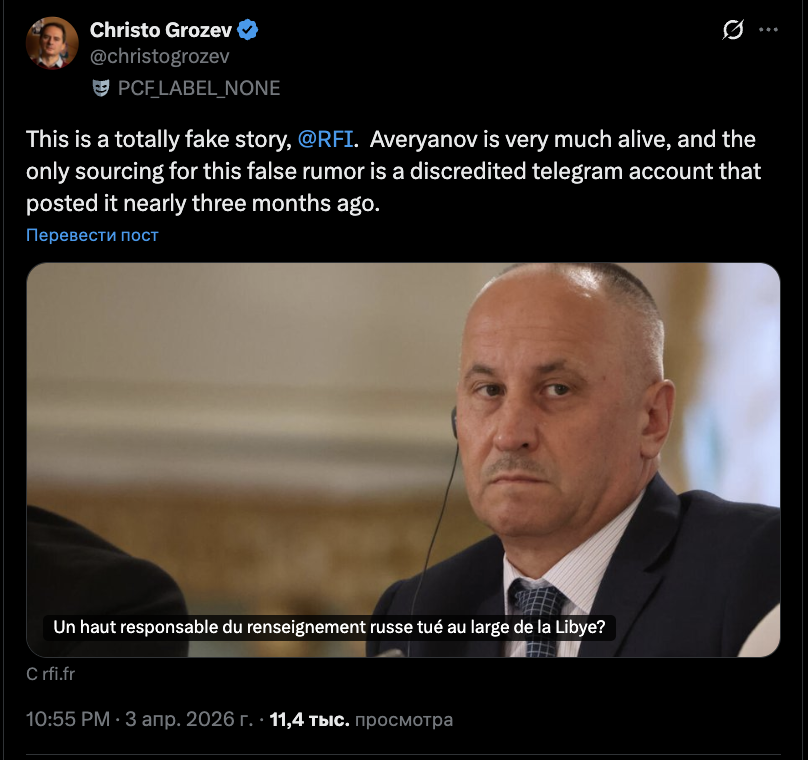 RFI сообщила о гибели генерала ГРУ Аверьянова, который курирует диверсии за рубежом. Христо Грозев назвал новость фейком