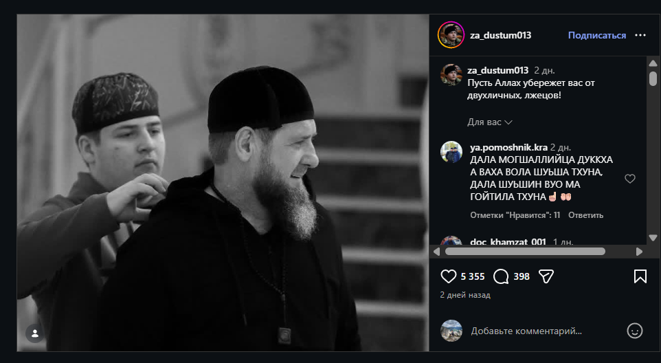 Детали. Instagram-аккаунт Za_dustum013, который позиционирует себя как команду Адама Кадырова, на следующий день после аварии опубликовал черно-белое фото Рамзана Кадырова с сыном и написал: «Пусть Аллах убережет вас от двуличных, лжецов!» Под постом начали оставлять пожелания здоровья Адаму, в том числе на чеченском. Один из них написал пользователь с ником ya.pomoshnik.kra.