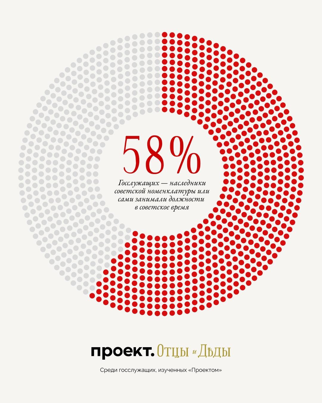 • Среди депутатов Госдумы выходцев из советских чиновничьих династий — 228 человек (61%), среди сенаторов — 154 (54%), в правительстве — 78 (55%), среди губернаторов — 33 (54%).