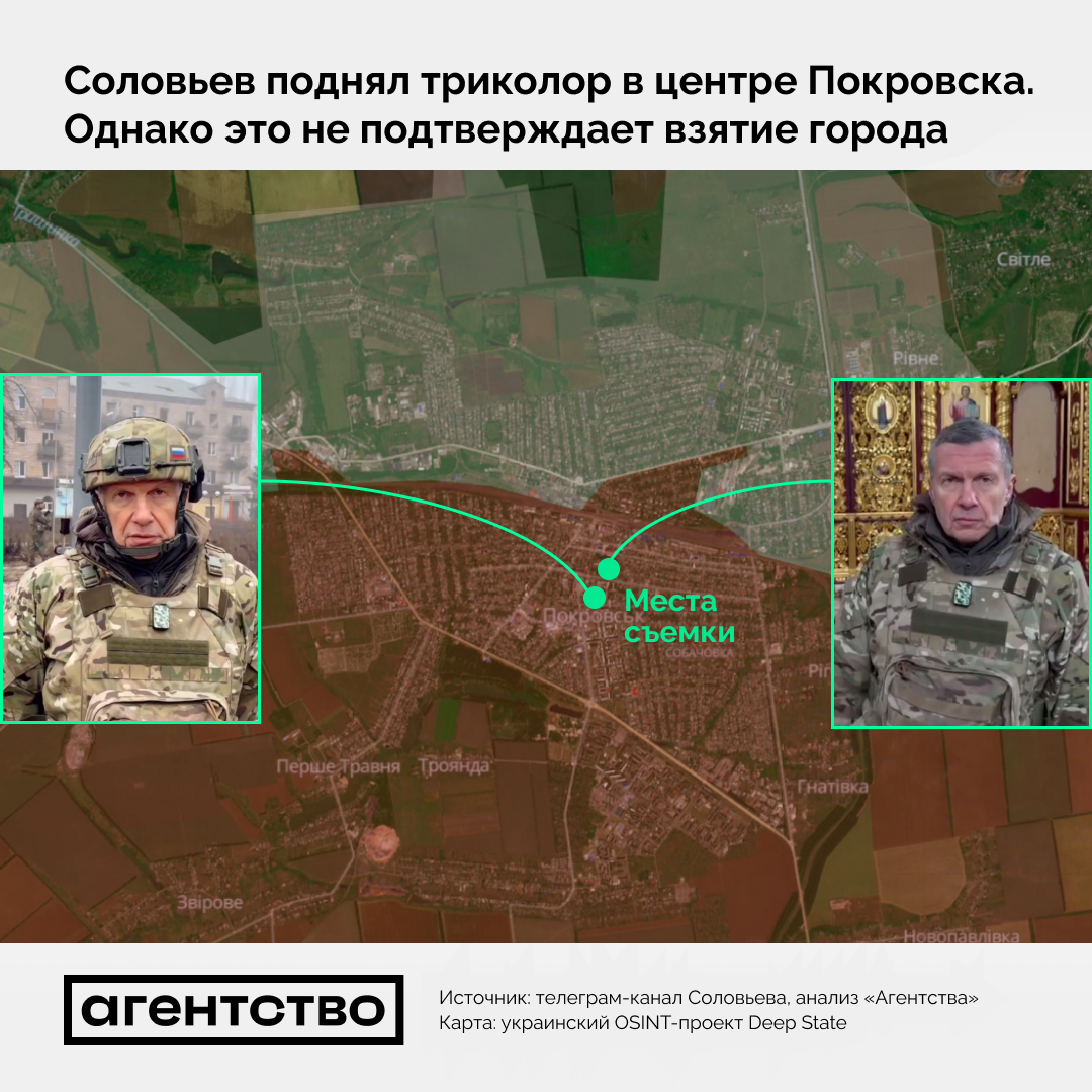 Владимир Соловьев в пятницу опубликовал несколько видеоанонсов своего воскресного репортажа для «России 1» из Покровска. На видео он поднимает флаг в центре города, заявляет, что «город в составе Российской Федерации», и сравнивает свою поездку с посещением Владимиром Зеленским Купянска. Это стало реакцией российской пропаганды на появление украинского президента в городе, который, по словам Владимира Путина, был «захвачен». Поднятие флага в центре Покровска не подтверждает российский контроль над городом, сообщили «Агентству» опрошенные военные аналитики.
