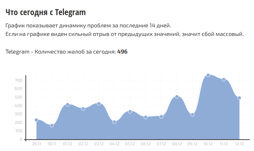 Детали. Количество жалоб на работу Telegram резко выросло со среды — в 1,5 раза по сравнению с максимальным суточным показателем за предыдущие 11 дней, свидетельствует сервис «Сбой.рф». 10−11 декабря он держится на уровне свыше 700 жалоб — этот показатель сопоставим с количеством жалоб на YouTube и WhatsApp, свидетельствуют данные сервиса. Треть всех жалоб на Telegram поступает от москвичей.