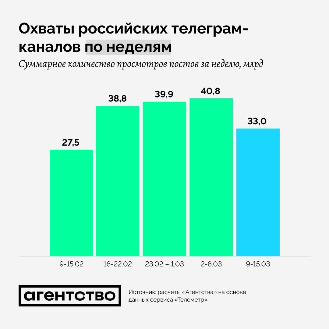 Детали. В субботу совокупное число просмотров публикаций всех 2,7 млн Telegram-каналов, которые Telemetr определяет как российские, оказалось на 20% меньше, чем в субботу неделей ранее, и на 12% меньше, чем в среднем в субботу (с первой рабочей недели этого года).
