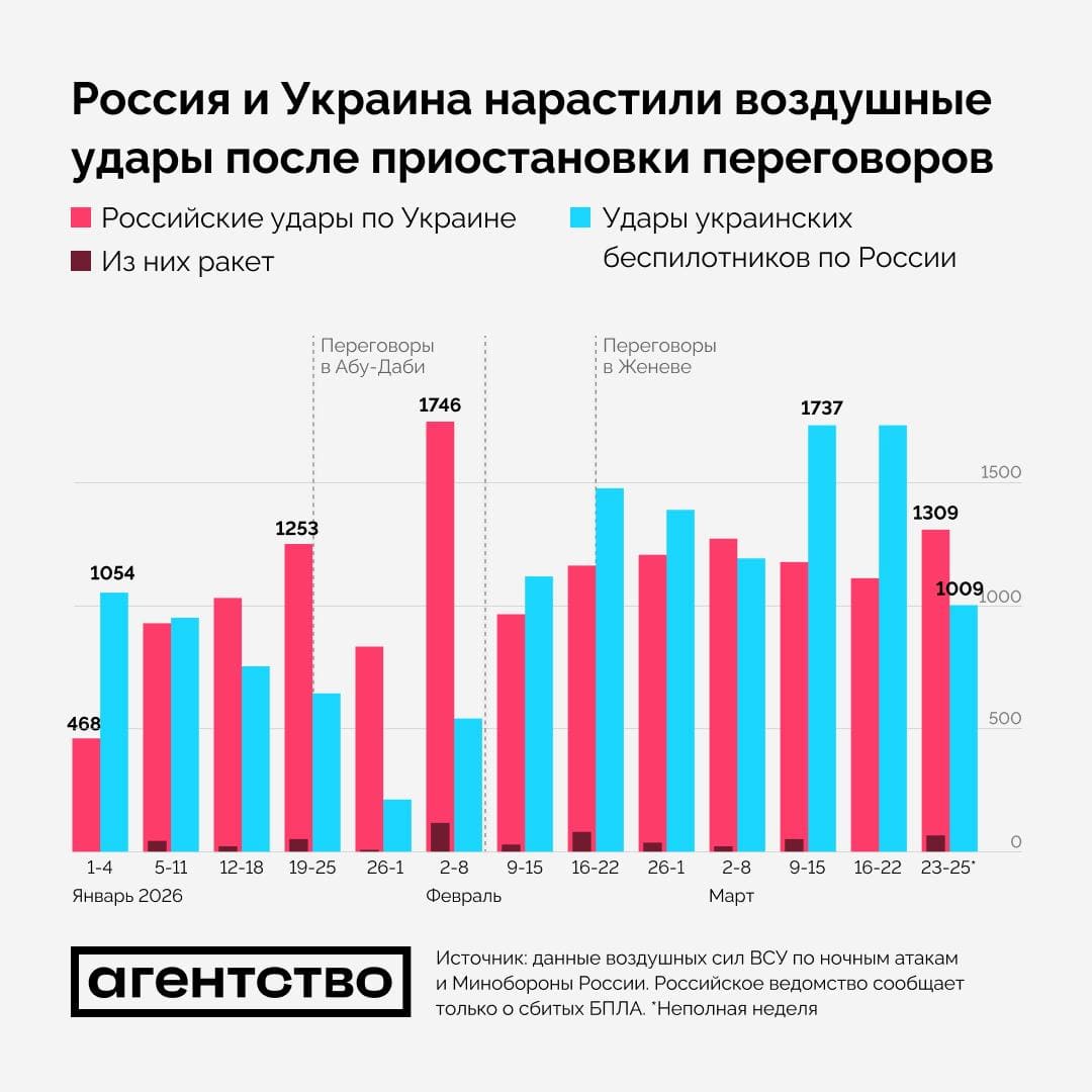 За последние три дня (23−25 марта) Россия выпустила по Украине 1309 дрона и 71 ракету, следует из данных, опубликованных Воздушными силами Украины. Это больше, чем в любую полную неделю с начала года, за исключением одной. Украина увеличила интенсивность атак по целям в России еще две недели назад. Усиление воздушных налетов происходит на фоне заморозки переговоров между Москвой и Киевом и активизации наступательных операций российской армии.