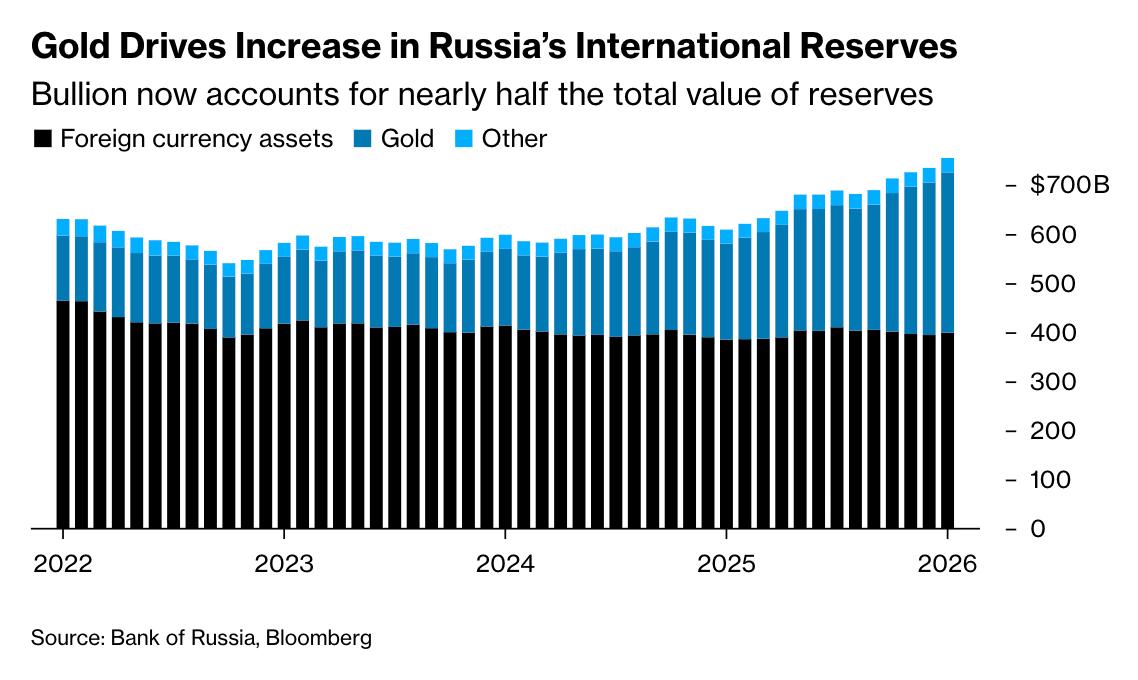 Стоимость золотых запасов Банка России увеличилась более чем на 216 миллиардов долларов с февраля 2022 года, несмотря на то, что ЦБ не делал крупных закупок металла, следует из расчетов Bloomberg. Это сопоставимо с суммой в 244 млрд долларов, к которой Россия лишилась доступа из-за заморозки своих суверенных фондов в ЕС, уточняет агентство.