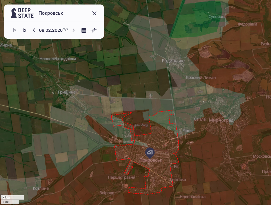 • DeepState пока не подтвердил взятие города — его северная часть все еще в «серой зоне». Однако проект отметил, что ВС РФ стягивают свои силы и туда. «Продолжаются хаотичные бои в северной части города остатками группировки сил обороны, находящихся в Мирнограде, для выхода которых нет никаких планов», — пишет DeepState.