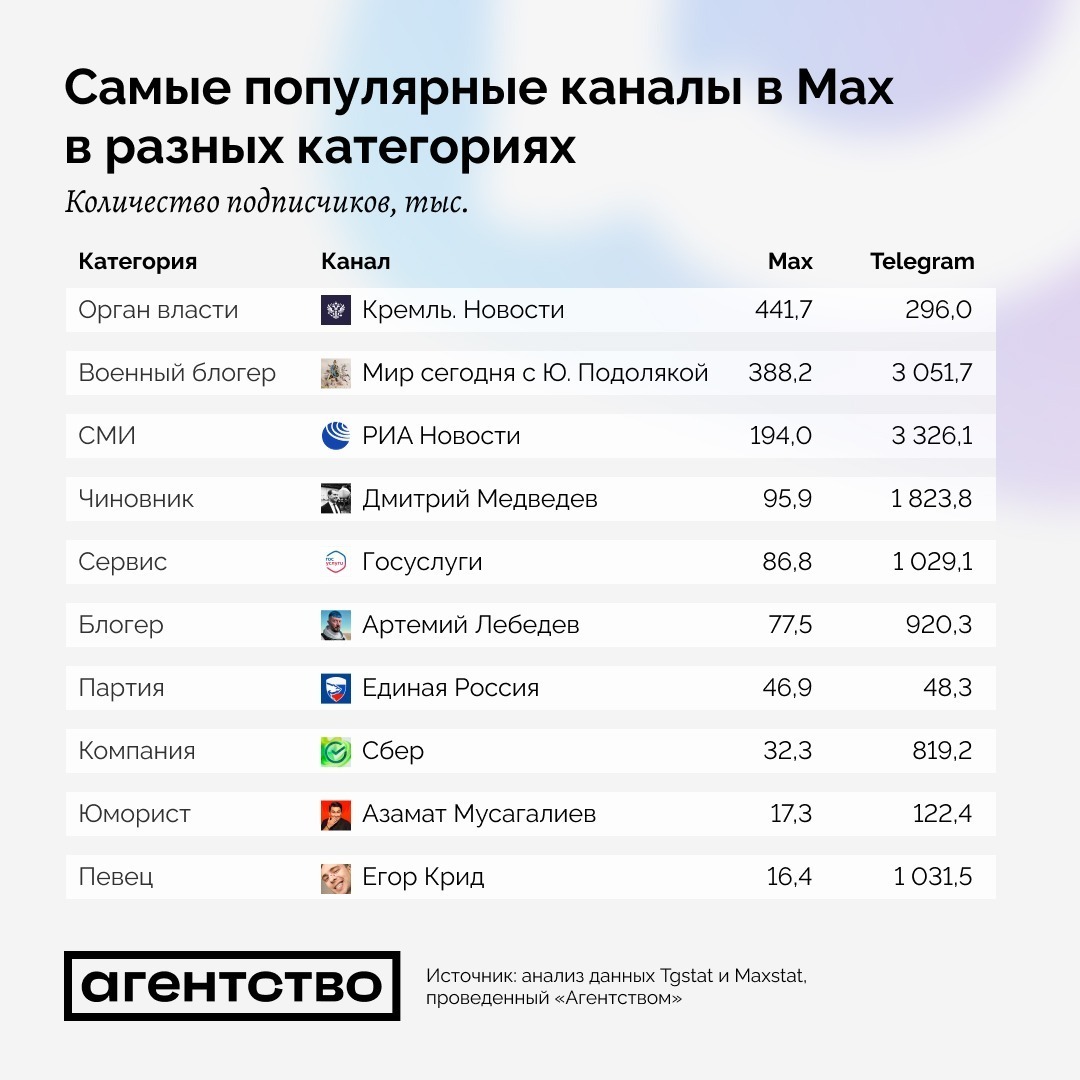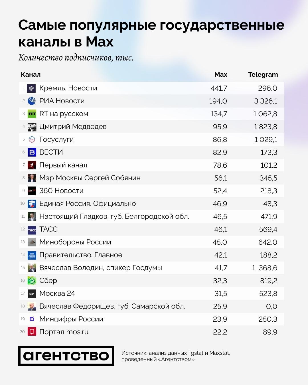 - ️На самое популярное в Max СМИ — РИА Новости — подписаны 193 тысячи пользователей. Это в 17 раз меньше, чем госагентство имеет в мессенджере Павла Дурова — 3,3 млн.
