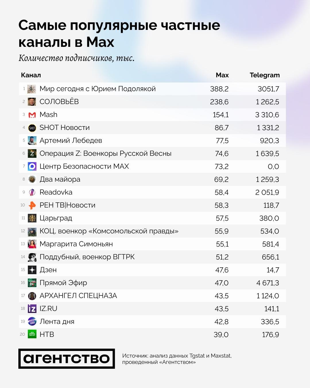 - ️Аудитория самого популярного в Max z-блогера Юрия Подоляки составляет 388 тысяч подписчиков. Аудитория в Telegram у него больше в 8 раз.