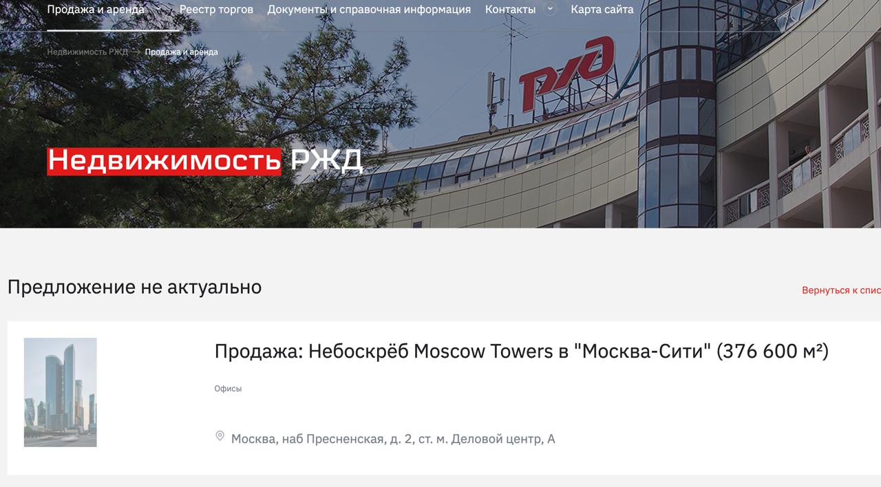 Детали. Сообщения о том, что РЖД выставила на торги небоскреб Moscow Towers, около 18 часов. Цена объекта — по запросу, говорилось в объявлении. А спустя два часа компания сообщила на своем сайте «РЖД Недвижимость», что «предложение не актуально» (см. скрин).