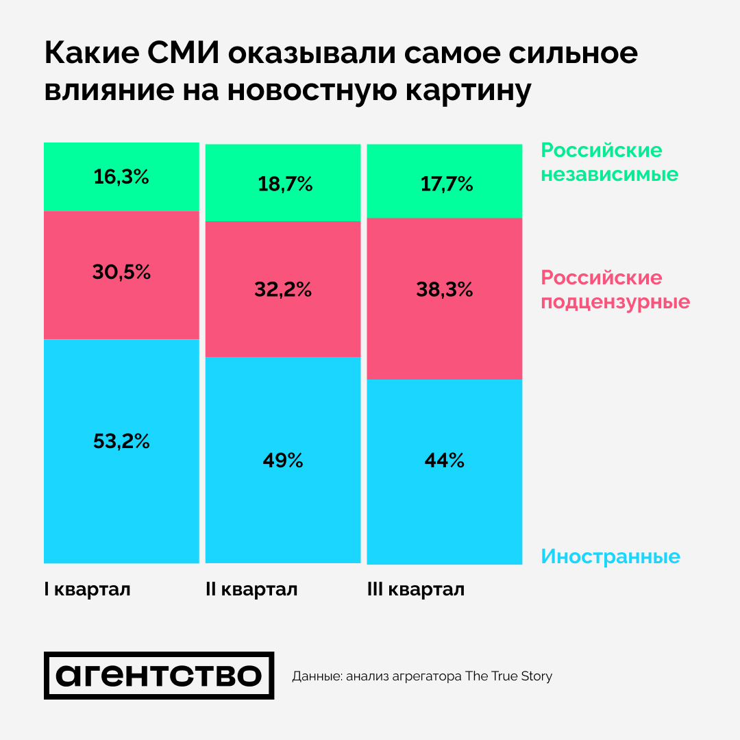 Замалчиваемые или освещаемые подцензурными СМИ с искажениями темы оказались в числе сюжетов, к которым было приковано основное внимание в русскоязычных медиа в третьем квартале, свидетельствует данные агрегатора The True Story, изученные «Агентством».