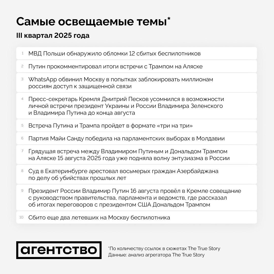 Детали. Переговоры Путина и Трампа на Аляске, вторжение российских беспилотников в Польшу, блокировка WhatsApp, выборы в Молдавии и последствия антиазербайджанского рейда в Екатеринбурге стали темами с самым большим числом публикаций в третьем квартале.