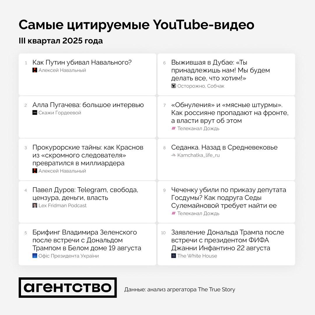 - ️Из видео, вышедших на YouTube, самое большое влияние на российское инфопространство оказали ролик Юлии Навальной «Как Путин убивал Навального?», интервью Аллы Пугачевой Катерине Гордеевой и расследование ФБК о генпрокуроре Игоре Краснове.