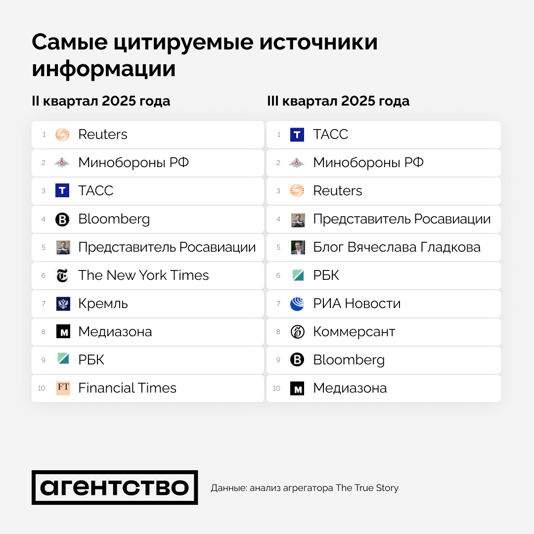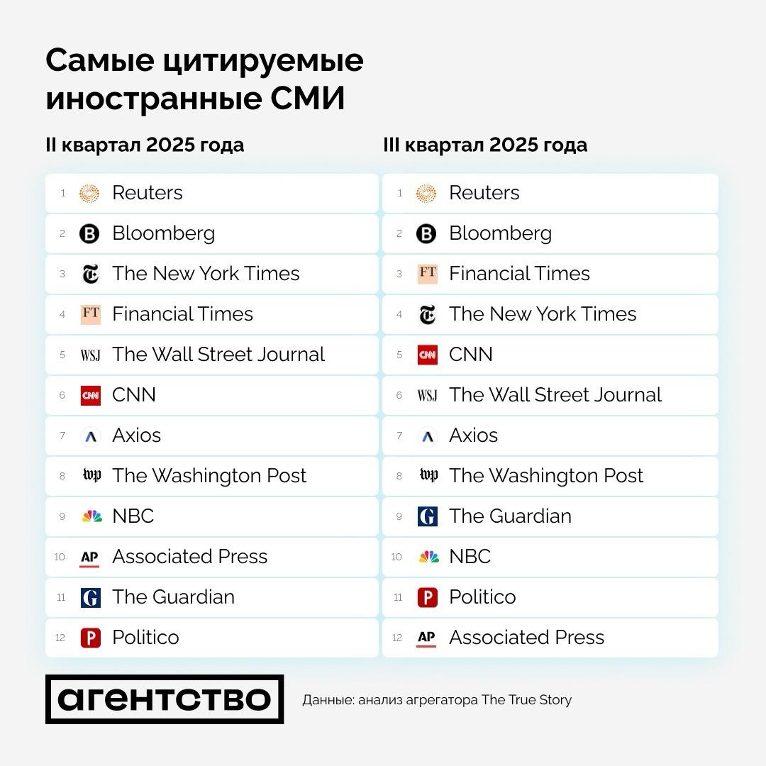 - ️Повышенный интерес к теме российско-американских переговоров позволил западным СМИ сохранить значительное влияние на российское инфопространство. Публикации, выходившие в крупнейших западных изданиях, становились источником для 44% новостей, проиндексированных новостным агрегатором The True Story в III квартале. При этом эта доля сократилась — с 53,2% в I квартале и 49% — во II, что, вероятно, является следствием того, что процесс переговоров затягивается.