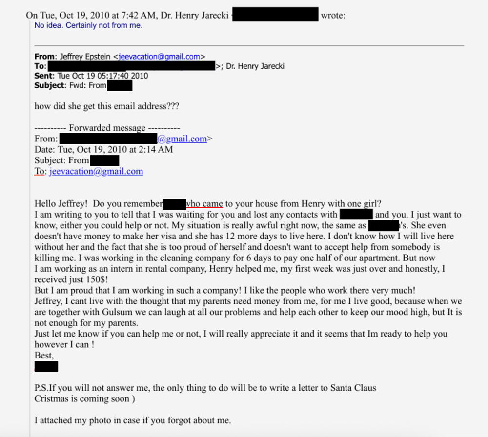 Это письмо Эпштейн с вопросом: «Как она получила этот адрес?» — переслал именитому американскому психиатру и филантропу Генри Джареки — вероятно, он и был тем Генри, который отправил девушек к Эпштейну. Имя Джареки уже звучало в связи с Эпштейном — в июне 2024 года одна из жертв обвинила его в изнасиловании и секс-траффикинге после того, как Эпштейн принудительно отправил ее на психиатрическое лечение к Джареки (впоследствии девушка отозвала свой иск к психиатру). Этот человек был лишь одним из винтиков сети Эпштейна по поиску все новых юных девушек из разных стран мира для самого Эпштейна и его влиятельных знакомых (пострадавшие девушки неоднократно рассказывали, что Эпштейн направлял их развлекать своих друзей, организовывая поездки в свои резиденции).