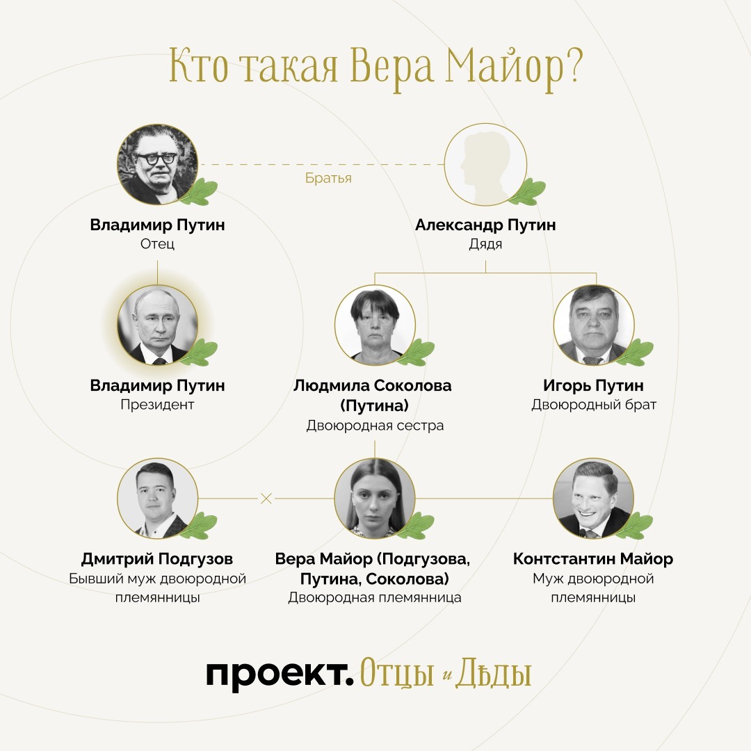 Кто такая Вера Майор-Подгузова-Путина. Она двоюродная племянница Владимира Путина по рязанской линии. В Рязани поселилась семья Александра Спиридоновича Путина, родного брата отца президента Владимира Спиридоновича Путина. У Александра Путина двое детей — Игорь Путин и Людмила Соколова (Путина), которой Вера приходится дочерью.