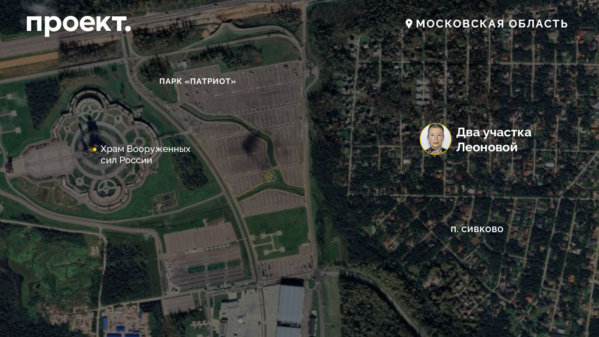 На Леонову оформлены также участки (с номерами 1493 и 1497) и коттедж в деревне Сивково через дорогу от подмосковного парка «Патриот», в котором находится главный храм Вооруженных сил России. Этот патриарший собор давно уже стал символом милитаризма и сращивания церкви с государством. На его стенах, например, есть изображение Иосифа Сталина и почти появились мозаики с ликами Владимира Путина, Сергея Шойгу и Валентины Матвиенко. Впрочем, в последний момент изображения чиновников убрали.