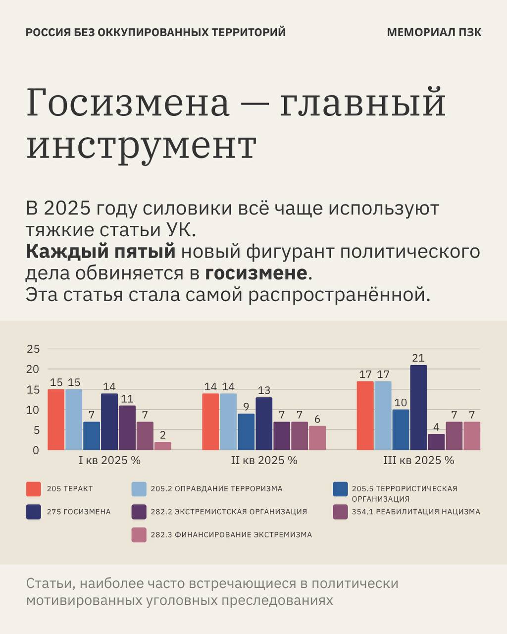 В третьем квартале 2025 года статья о «госизмене» стала самой популярной в политических делах в России, выяснил правозащитный проект «Поддержка политзаключенных. Мемориал», проанализировав судебную статистику, данные от правоохранительных органов и самих преследуемых и их семей.