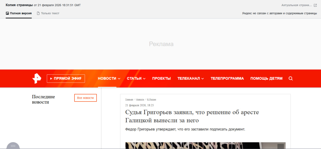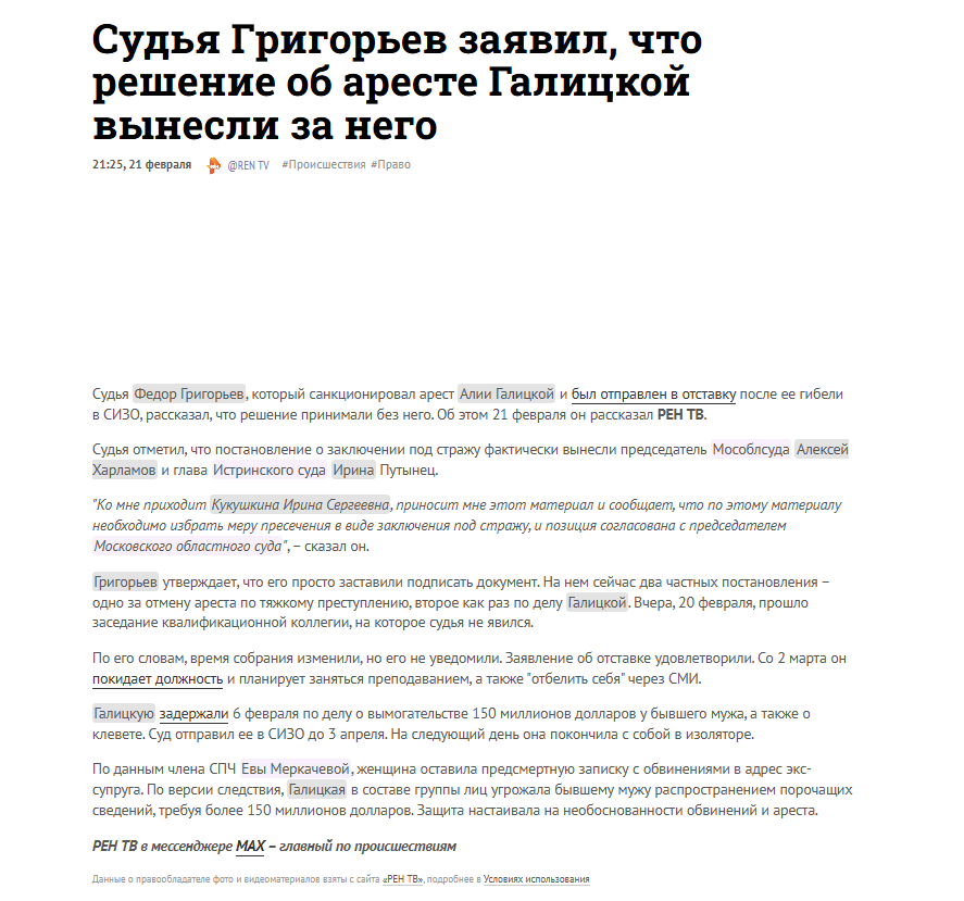 Детали. Заметка под заголовком «Судья Григорьев заявил, что решение об аресте Галицкой вынесли за него» вышла на сайте РЕН ТВ в субботу в 18:25. Сейчас публикация удалена с сайта, однако «Агентство» подтвердило факт ее публикации с помощью кэша «Яндекса». Целиком она сохранилась в одном из новостных агрегаторов (см. иллюстрации к заметке).