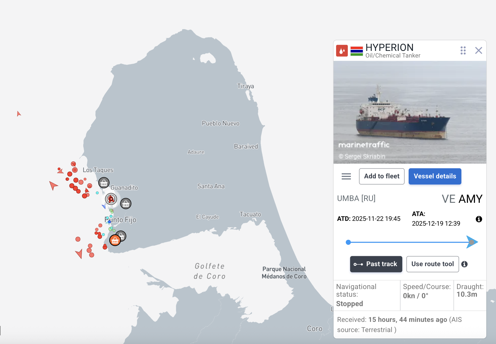 Детали. Трамп объявил о введении блокады в среду. В это время, согласно сервисам отслеживания судов, танкер Hyperion находился недалеко от Гренады. В четверг вечером танкер, вышедший из Мурманска в конце ноября, вошел в воды Венесуэлы, и в пятницу после полудня бросил якорь в порту Амуай, где расположен крупнейший нефтеперерабатывающий комплекс Венесуэлы.