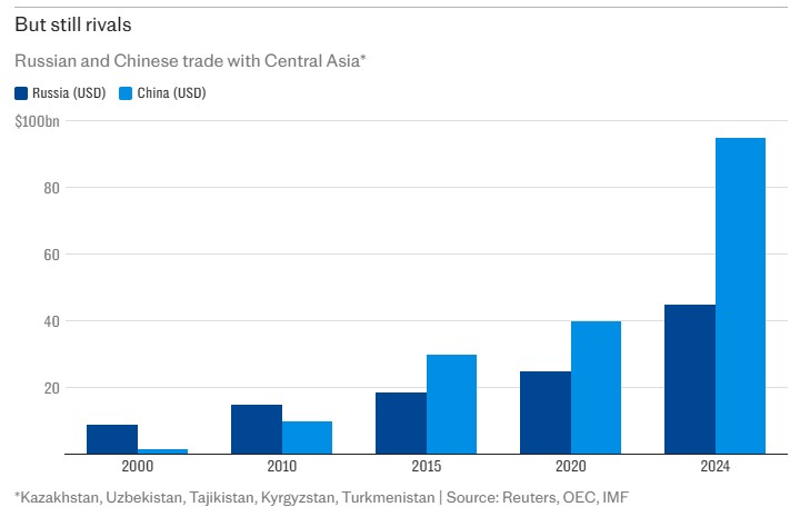 - Четверть века назад ситуация была прямо противоположной. В 2000 году объем торговли России со странами Центральной Азии более чем в пять раз превышал торговлю Китая с этим регионом, пишет The Telegraph. Российский товарооборот с Казахстаном, Узбекистаном, Таджикистаном и Кыргызстаном в 2000 году составлял 9 млрд долларов, китайский — менее 2 млрд. В 2010 году объем торговли России и Центральной Азии был выше ее товарооборота с Китаем в полтора раза — 15 млрд долларов против 10 млрд.