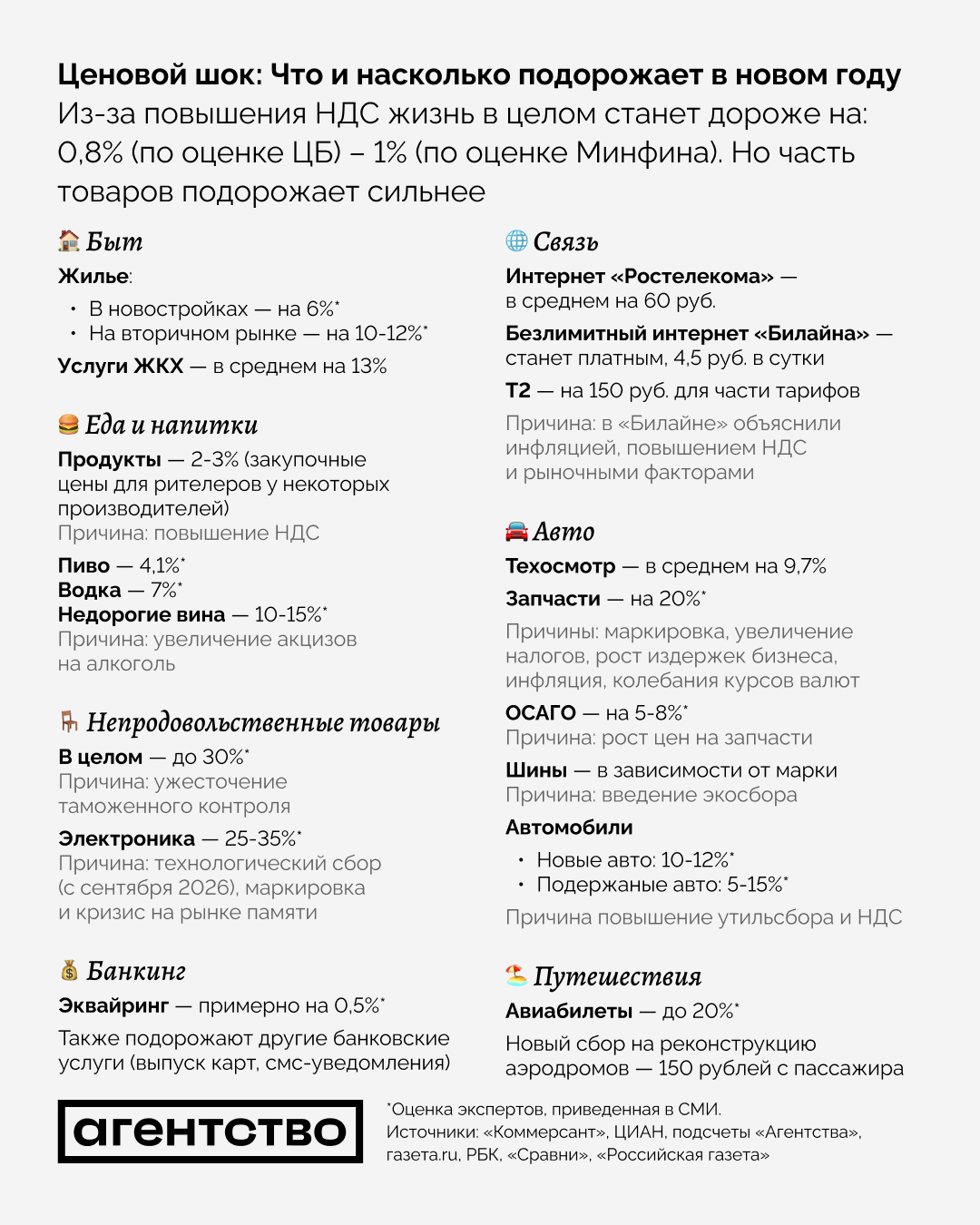 Повышение налогов и сборов в 2026 году приведет к росту цен на товары и услуги по всей стране. Только изменение НДС с 20% до 22% приведет, по оценке ЦБ, к росту цен на 0,8%, а по данным Минфина — на 1%. При этом на некоторые товары (например, электронику и импорт) рост может быть ощутимо больше — до 30%. Кроме того, существенно подорожают услуги ЖКХ, обслуживание авто, сами машины, путешествия. «Агентство» собрало, что сообщалось в последние недели о грядущем повышении цен.