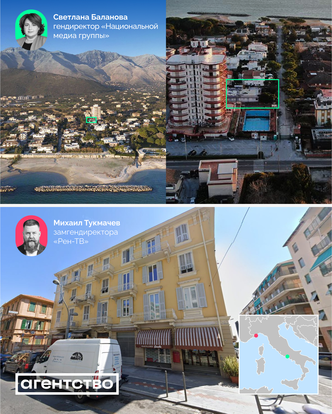 Санкции ЕС заморозили дорогую недвижимость по крайней мере двоих топ-менеджеров «Национальной Медиа Группы» («Первый канал», «Рен ТВ», «Известия» и др.), которой руководит Алина Кабаева. Гендиректору НМГ Светлане Балановой принадлежит 300-метровая вилла на берегу Средиземного моря примерно в 100 км от Неаполя, а замгендиректору «Рен ТВ» Михаилу Тукмачеву — две квартиры и гараж на курорте Сан-Ремо, выяснил проект «Агенты войны» («Агентство» получило данные до публикации). Оба пропагандиста были внесены в санкционные списки Евросоюза в декабре 2022 года.
