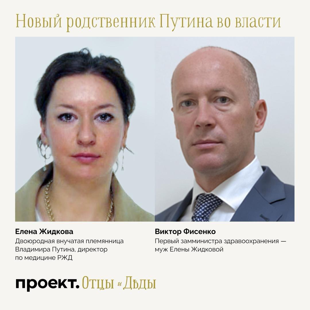 Внучатая двоюродная племянница президента России, генеральный директор «РЖД-Медицина» Елена Жидкова в этом году сменила фамилию на Фисенко. Такую же фамилию носит первый заместитель министра здравоохранения России. Жидкова и Виктор Фисенко вступили в брак, сообщил собеседник «Проекта» в медицинских кругах. Об этом косвенно свидетельствуют и другие факты, обнаруженные при проверке этой информации.