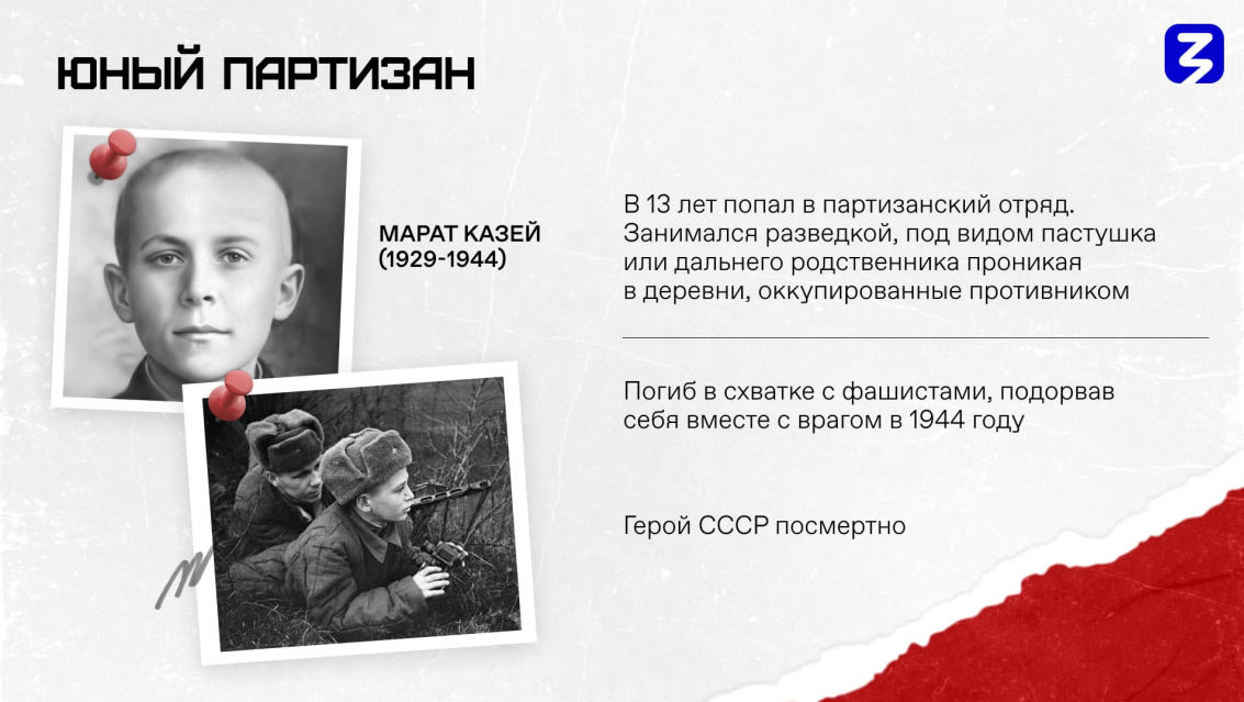 - ️Цитата. «В мае 1944 года деревня, в которую Марат и начальник разведки отряда Ларин пришли на встречу со связным, оказалась в кольце карателей. <…> Разведчики вступили в бой. После того как Ларин погиб, юный партизан сражался до последнего патрона. Когда боеприпасы иссякли, Марат подорвал себя и приближающихся немцев с помощью гранаты. Юному разведчику было 14 лет», — указано в сценарии.