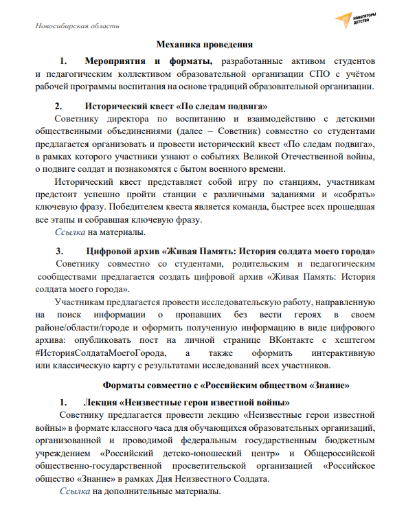 - ️Методичка предлагает учителям несколько вариантов мероприятий к памятной дате: провести исторический квест «По следам подвига», собрать архив о пропавших без вести солдатах или провести лекцию «Неизвестные герои известной войны», подготовленную обществом «Знание».