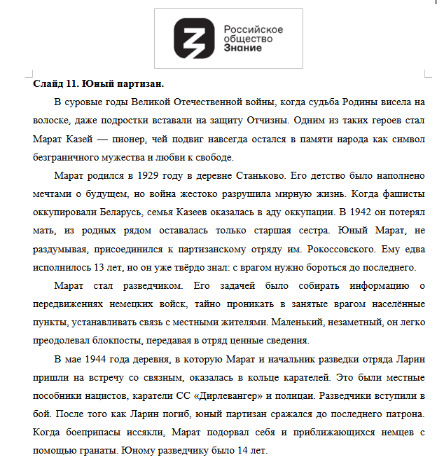 - ️Лекция рассказывает о действиях советских разведчиков и партизан на оккупированных территориях во время войны, следует из ее сценария на сайте общества. В лекции также говорится о «феномене детского участия в военных действиях, о детях-партизанах и их роли в сопротивлении». В качестве примера приводится история 14-летнего партизана Марата Казея, который покончил с собой во время боя.
