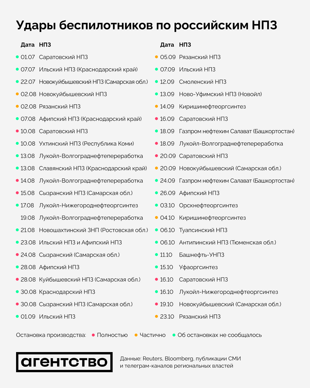 - ️С начала октября это уже 10-й удар украинских беспилотников по российским НПЗ, следует из публикаций властей, СМИ и телеграм-каналов, проанализированных «Агентством». В сентябре таких атак было 13, в августе — 18, в июле — три.