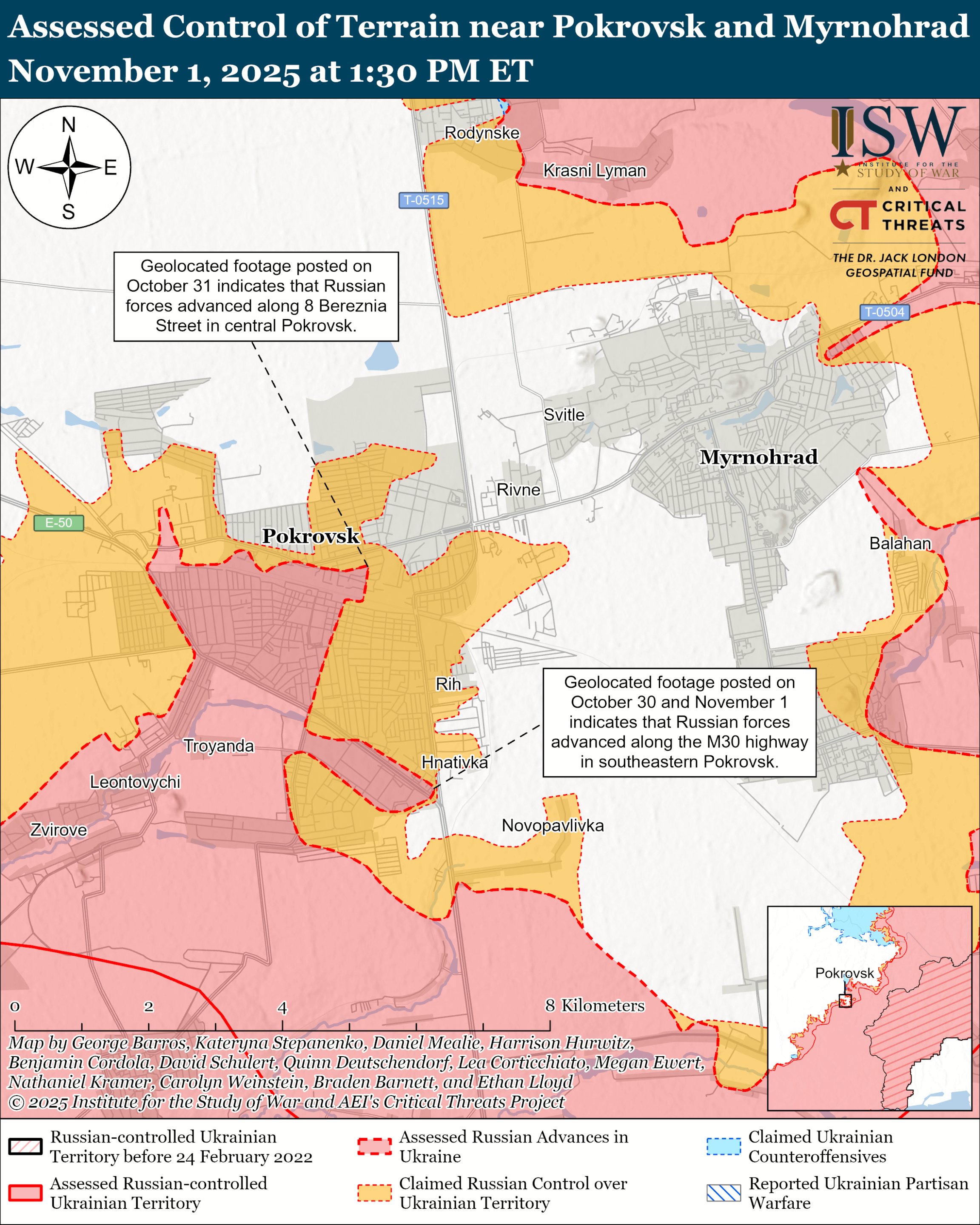 - Российские войска усиливают наступление в Покровске и его окрестностях, чтобы захватить город, сообщил в сводке в ночь на воскресенье Институт изучения войны (ISW). Геолоцированные проектом кадры свидетельствуют о продвижении российских военных в центральной и юго-восточной части.