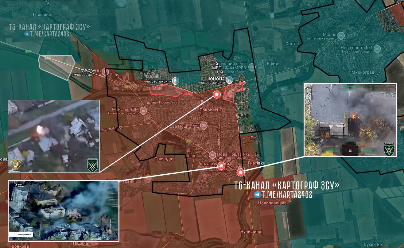 - Другой OSINT-проект «Картограф ЗСУ» в субботу со ссылкой на источники в ВСУ сообщил, что российские военные «есть по всему Покровску, а не только где-то на окраинах». По оценке проекта, российская армия контролирует 18,9 кв. км города, а силы ВСУ — 6,1 кв. км. «Таким образом можно сказать, что 79% города находится либо под контролем российских военных, либо в серой зоне», — сообщил проект.