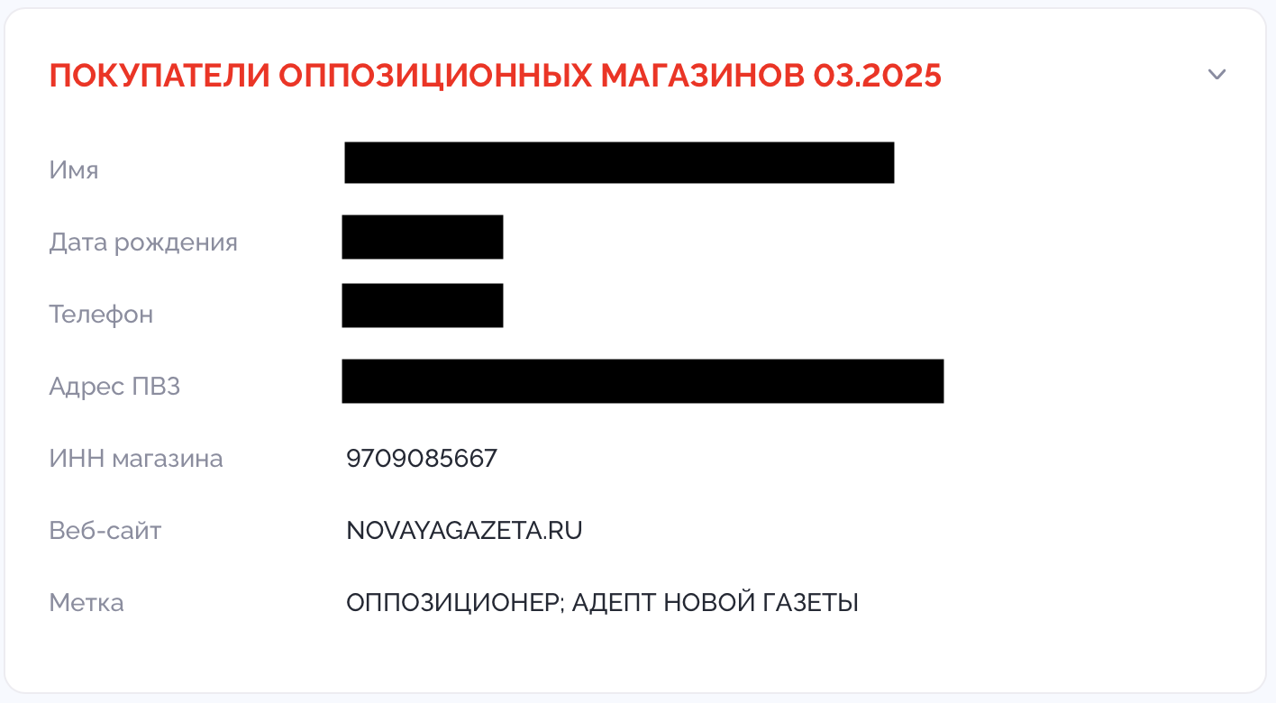 - ️«Агентство» обнаружило эту базу после того, как наткнулось на ее упоминание в одной из утечек. Этот человек попал в базу «Покупатели оппозиционных магазинов» после того, как сделал покупку в магазине «Новые продажи», который продает продукцию с логотипом «Новой газеты». В базе агрегатора этот покупатель получил помету «оппозиционер, адепт „Новой газеты“». «Агентству» не удалось в пятницу связаться с магазином.