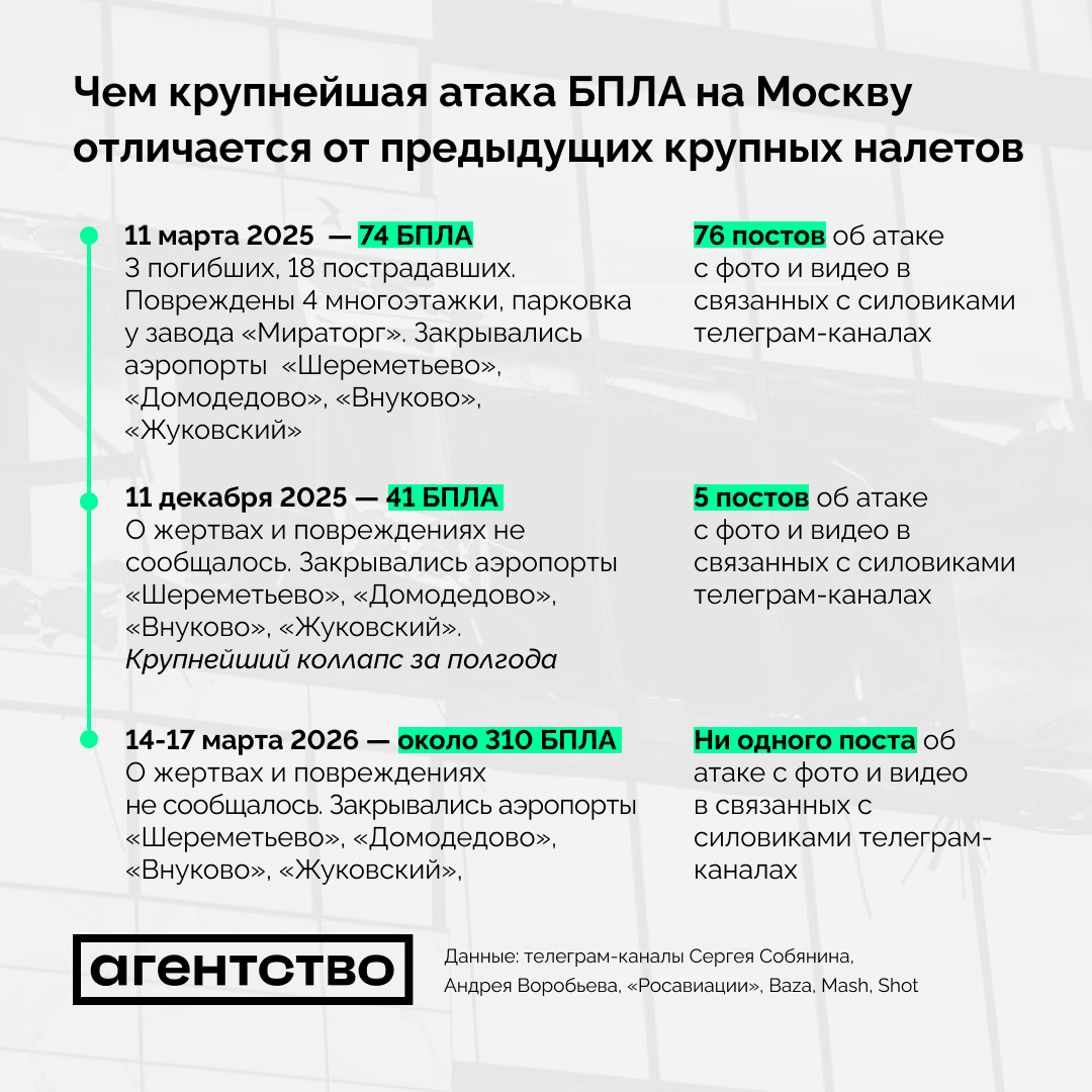 Во вторник власти продолжили сообщать о массированной атаке дронов на Москву, которая началась в субботу. С выходных, по заявлениям мэра Москвы Сергея Собянина, российская ПВО сбила около 310 дронов, летевших в направлении столицы. Несмотря на рекордное число дронов, задействованных, по данным Собянина, в налете, он прошел практически без последствий (известно лишь о периодических закрытиях аэропортов). «Агентство» сравнило последствия «рекордного» налета на Москву с двумя крупнейшими атаками на столицу до этого — 11 марта и 11 декабря прошлого года. В первом случае, когда был использован 71 дрон, налет сопровождался разрушениями и человеческими жертвами, а во втором случае применение 41 дрона привело к коллапсу в столичных аэропортах.