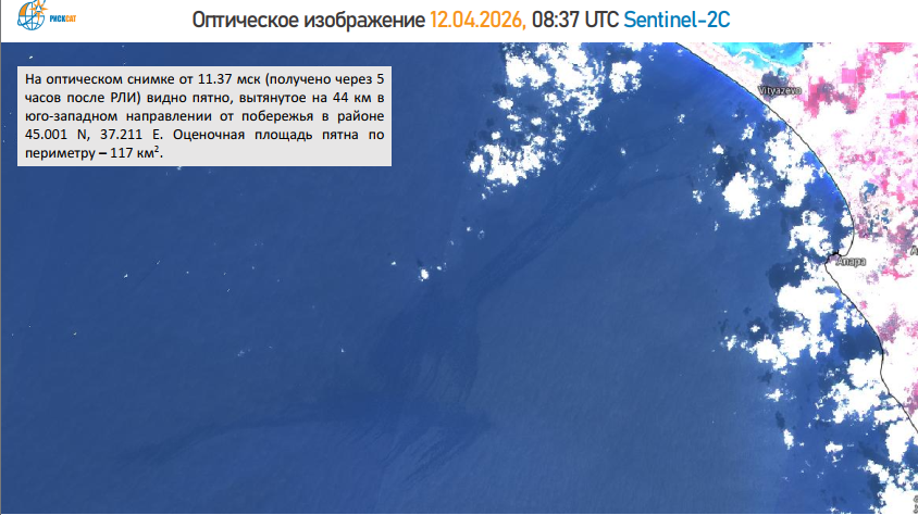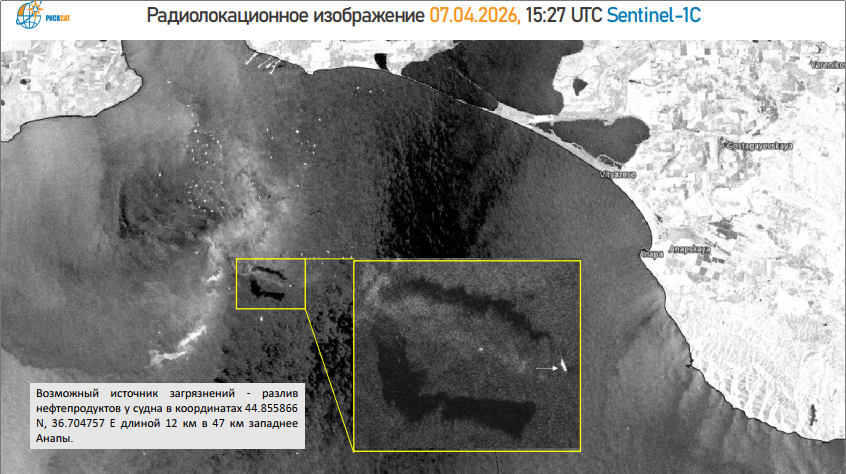 Детали. Пятно зафиксировано на радиолокационном и мультиспектральном изображениях спутника Sentinel-1А, полученных в ночь на понедельник с интервалом в пять часов. Пятно вытянуто в юго-западном направлении на 43 км и уже достигло побережья Анапской косы, свидетельствует анализ экологов.