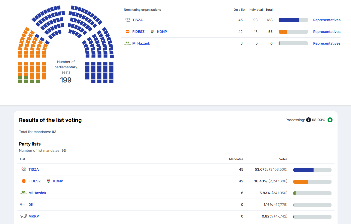 Детали. После обработки 98,93% бюллетеней «Тиса» во главе с Мадьяром получает 138 мест в парламенте Венгрии, «Фидес» Орбана — 55, еще шесть мест — крайне правая партия «Наше отечество» (Mi Hazánk), свидетельствуют данные Национальной избирательной комиссии Венгрии.