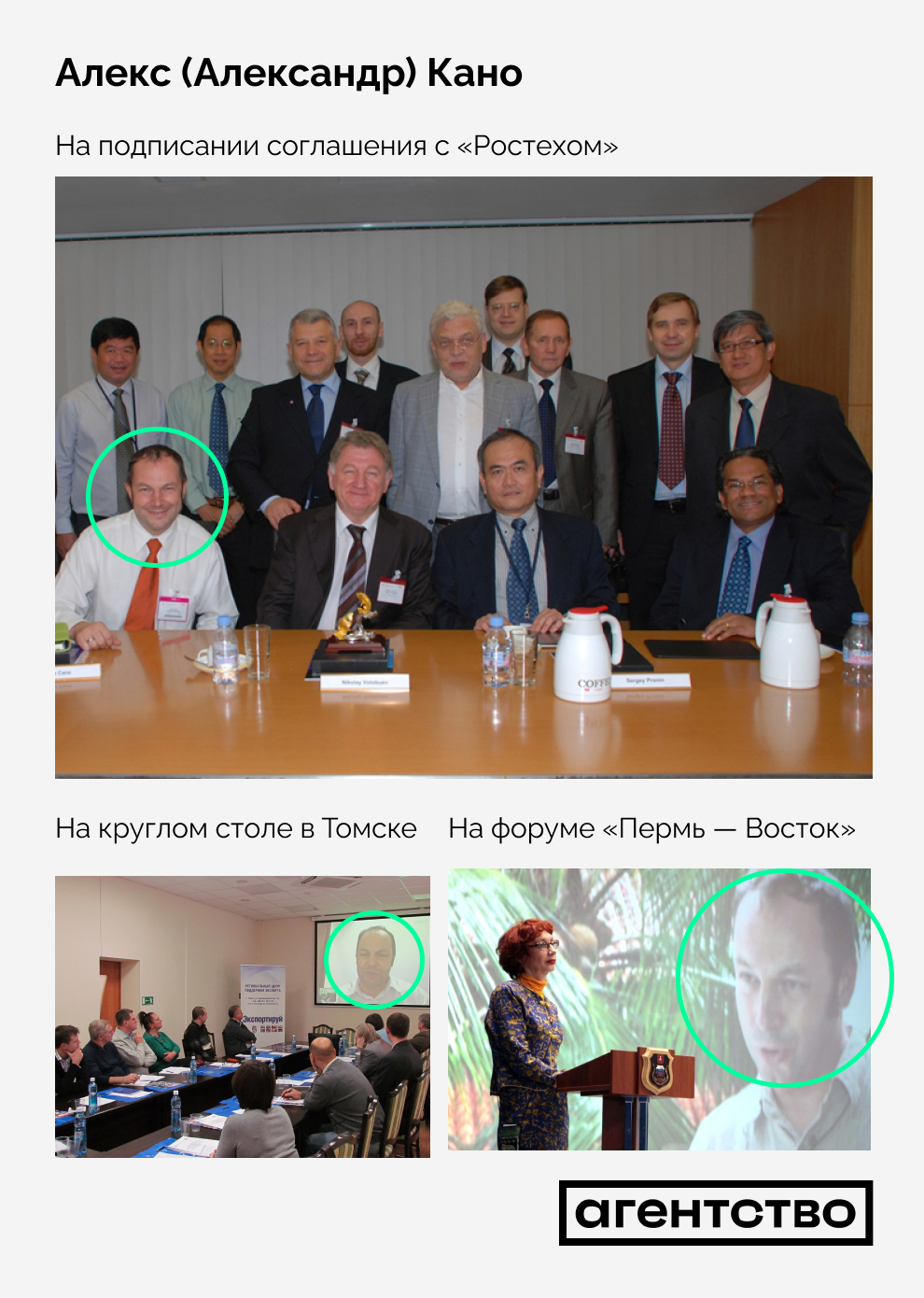 • Baza опубликовала фото Алекса Кано. Человек на этом снимке в начале 2010-х посещал мероприятия, посвященные российско-сингапурскому сотрудничеству, свидетельствует анализ «Агентства». Например, в 2011 году он принимал в Сингапуре участие в подписании меморандума о взаимопонимании между Singapore Technologies Electronics и «Ростехом» (публикация об этом сохранилась только в архиве). Тогда, согласно релизу российской стороны, компании решили «объединить свои усилия и возможности в целях развития взаимовыгодного сотрудничества между Российской Федерацией и Сингапуром в экономической и технологической областях». «Агентству» не удалось установить, в какой роли Кано присутствовал на этом мероприятии.
