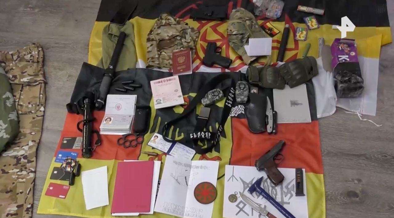 • В ходе обысков у подозреваемых изъяли взрывные устройства, гранату Ф-1, пистолет Макарова с глушителем, два газовых пистолета и рации, утверждает ФСБ. Также, согласно заявлению спецслужба, были изъяты «неонацистская атрибутика и символика украинских военизированных формирований, а также инструкция по вступлению в состав запрещенной в РФ украинской террористической организации». На видео, опубликованном спецслужбой, можно увидеть нашивку с коловратом, черно-желто-белый флаг с коловратом, флаг Германии с гербом и рисунок, на котором изображен украинский военный.