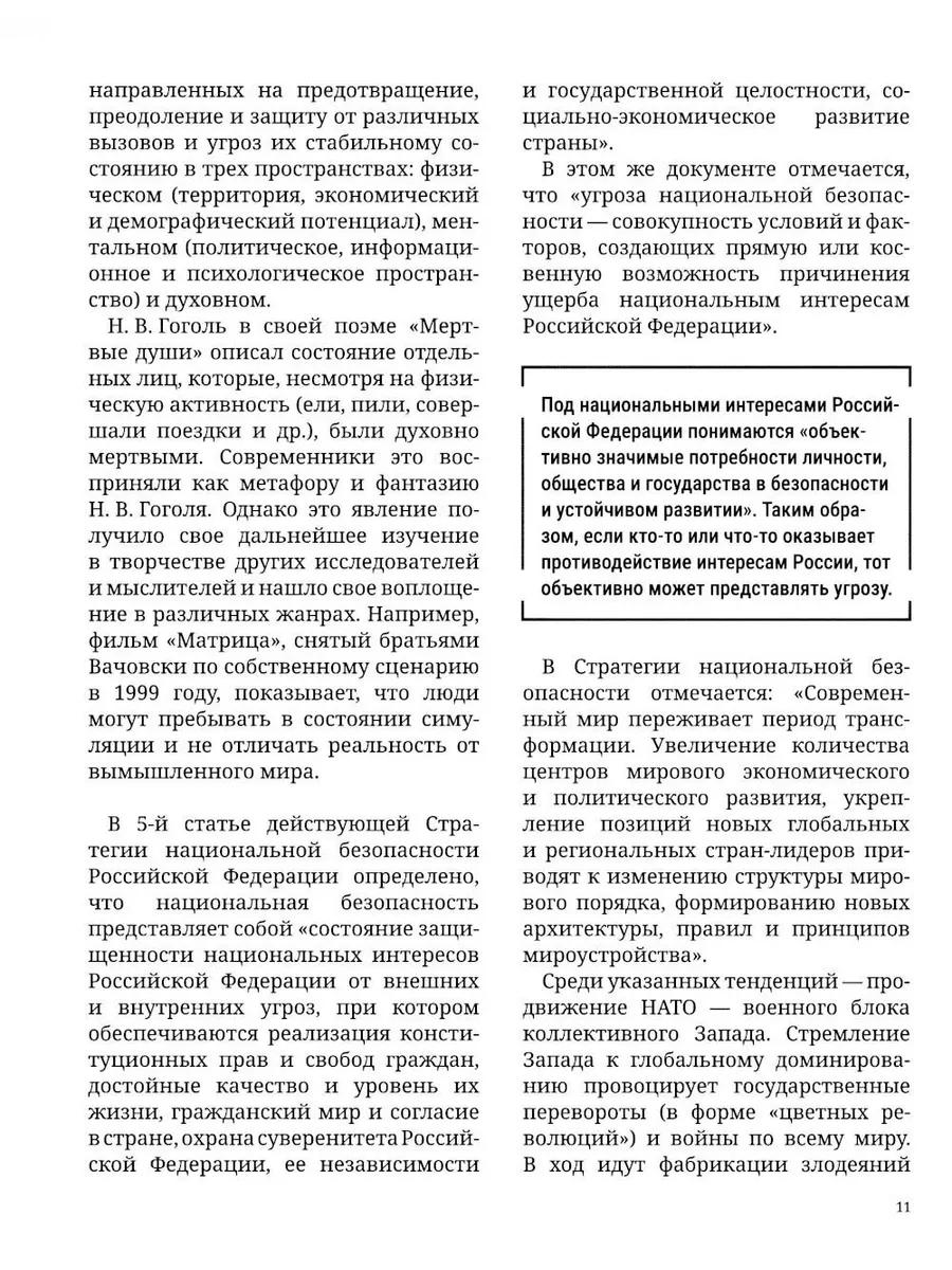 - ️Пособие начинается с главы о безопасности. Ее первая часть называется «Национальная безопасность в современном мире». В ней говорится, что нацбезопасность — это «сложная многоуровневая система связей и отношений субъектов безопасности», которая направлена на защиту от вызовов «в трех пространствах: физическом, ментальном и духовном». Сразу после этого авторы учебника рассказывают о поэме «Мервые души» и с нее неожиданно переключаются на фильм «Матрица».
