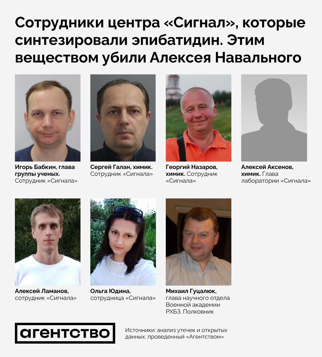 • Авторы статьи не были сотрудниками этой лаборатории, свидетельствуют утечки данных пенсионного фонда. Зато шестеро из семи соавторов — штатные сотрудники НЦ «Сигнал». Это химики Игорь Бабкин, Сергей Галан, Георгий Назаров и Алексей Аксенов, Ольга Юдина (известно, что она старший научный сотрудник 22-й лаборатории научно-производственного отдела), а также и Алексей Ламанов (заведующий 23-й лабораторией научно-производственного отдела). «Агентству» не удалось установить связь с «Сигналом» лишь одного соавтора — полковника Михаила Гуцалюка. Он — начальник отдела организации научной работы и подготовки научно-педагогических кадров в Военной академии радиационной, химической и биологической защиты.