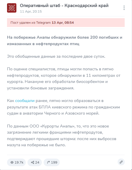 • В понедельник в 8:54 пост был удален, однако публикация сохранилась в сервисе TGstat. Посты о погибших и испачканных птицах еще до оперативного штаба Краснодарского края также удалили телеграм-каналы «Краснодар Движение» и «Новости Севастополь».