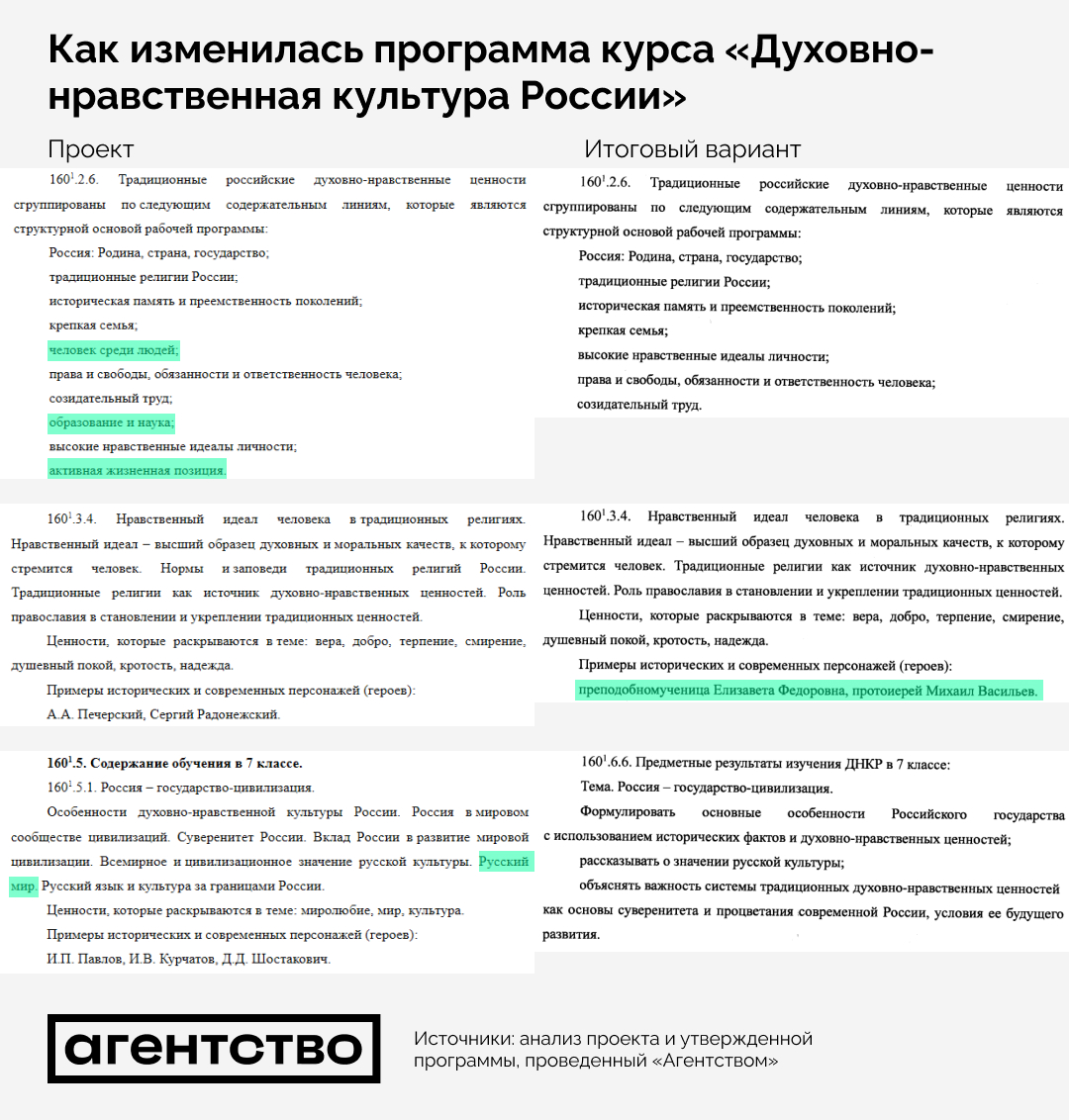 В пятницу Минпросвещения утвердило учебную программу по новому курсу «Духовно-нравственная культура России» для школьников 5−7 классов, которая с 2026 года заменит часть уроков иностранного языка. В сравнении с проектом итоговый документ скорректировали. Из программы в итоге удалили упоминание «Русского мира», но добавили в качестве примера нравственного идеала погибшего в Украине «батюшку ВДВ», показывает анализ «Агентства».