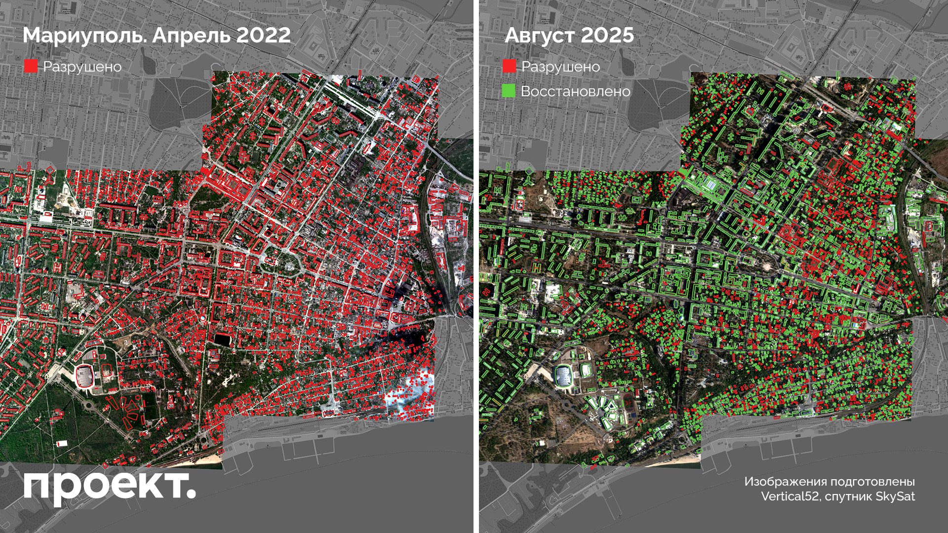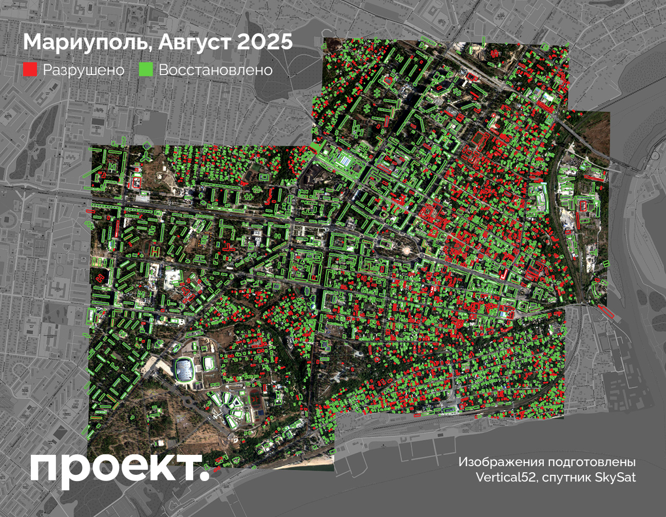 Детали. «Проект» проанализировал 5190 зданий в центре города. Эта территория и прилегающие районы описаны в официально опубликованной части мастер-плана Мариуполя, который Хуснуллин презентовал Путину. Для оценки разрушений использовались снимки апреля 2022-го года и конца августа 2025-го. Они изучались с помощью предоставленной Vertical52 модели анализа изменения структуры крыши и фасада домов (подробную методологию читайте на сайте «Проекта»). На иллюстрациях к посту мы отметили красным разрушенные строения, зеленым — сохранившиеся и восстановленные.