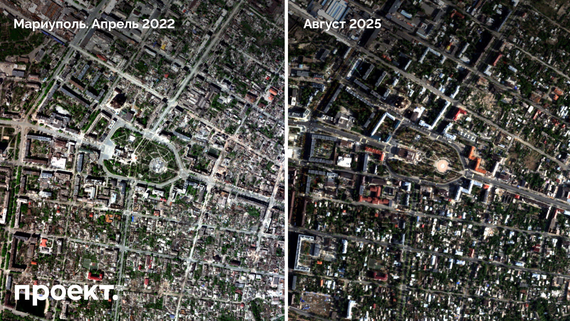Более 30% строений в центре Мариуполя, который должен был стать главной витриной российской оккупации, оставались разрушенными к началу осени 2025 года, свидетельствует анализ спутниковых снимков, проведенный «Проектом» и командой Vertical52. По плану застройки города, который в 2022-м году вице-премьер Марат Хуснуллин представил Владимиру Путину, Мариуполь должны были восстановить за три года, то есть к лету 2025-го.