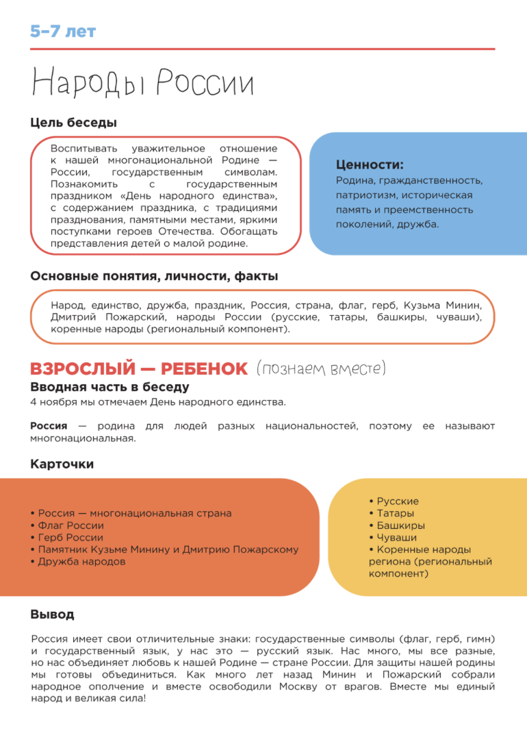• В рамках «Добрых игр» уже вложены методические рекомендации для воспитателей. Согласно этим рекомендациям, при обсуждении темы «Народы России» с детьми 3−5 лет воспитатель должен сказать: «Нас много, мне все разные, но нас объединяет любовь к Родине — стране России. Для защиты нашей Родины мы готовы объединиться». А при разговоре с детьми 5−7 лет к этой фразе нужно добавить: «Как много лет назад Минин и Пожарский собрали народное ополчение и вместе освободили Москву от врагов».