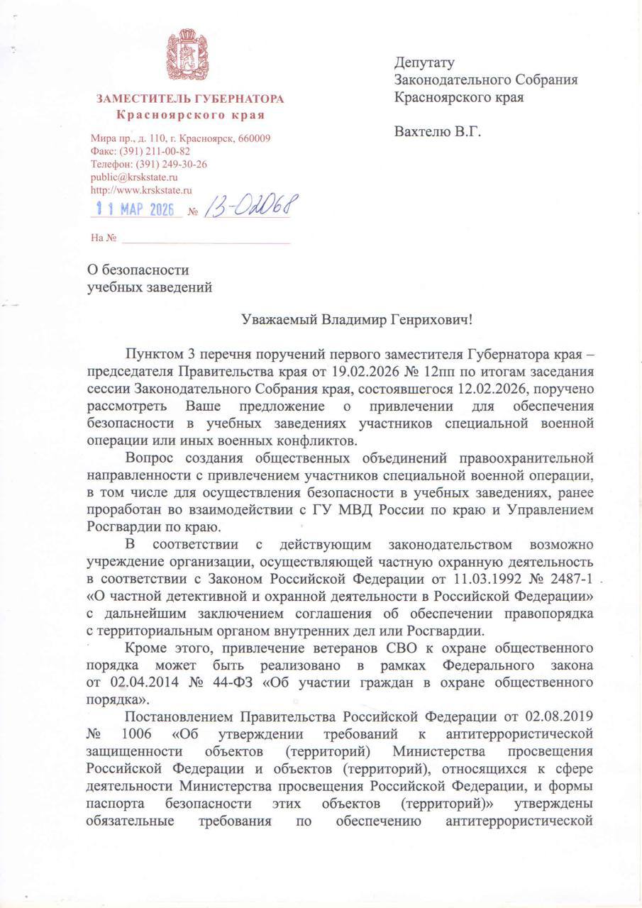 - ️Решение привлекать ветеранов в охраняющие школы ЧОПы было принято по итогам рассмотрения предложения Вахтеля, которое он сделал на заседании красноярского закса 12 февраля. Несколькими днями ранее произошло два нападения на школы: в Красноярске 4 февраля школьница устроила поджог и напала с молотком на учеников, а днем ранее в Кодинске другая школьница напала с ножом на одноклассницу и попыталась ударить учителя.