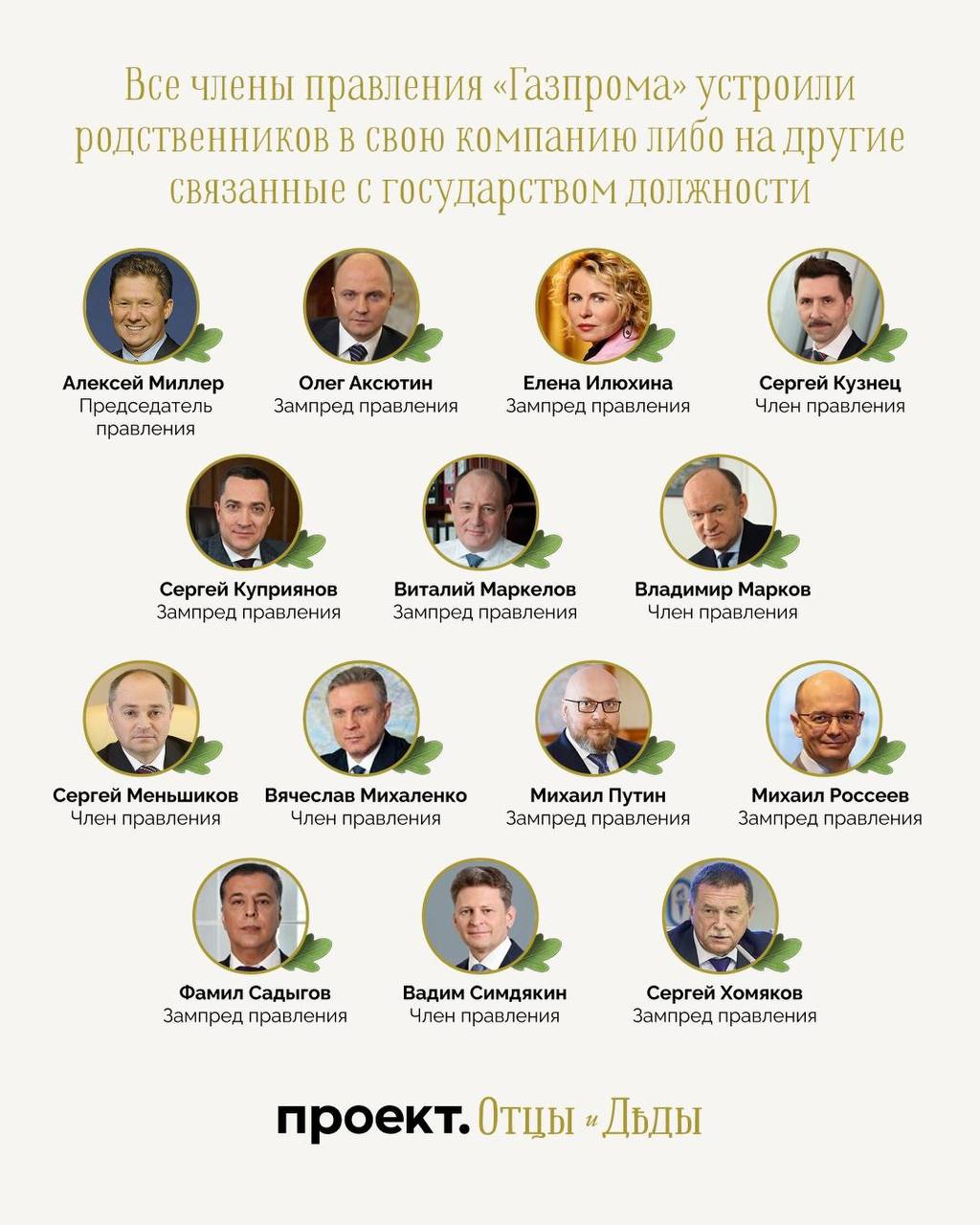 У всех 14-ти членов правления «Газпрома» есть родственники, которые работают (либо работали) на госслужбе или в связанном с государством бизнесе. У подавляющего большинства из них, 12 членов правления, есть родственники, в разное время трудившиеся в структурах газовой компании. «Проект» обнаружил это при проведении исследования кумовства в России.